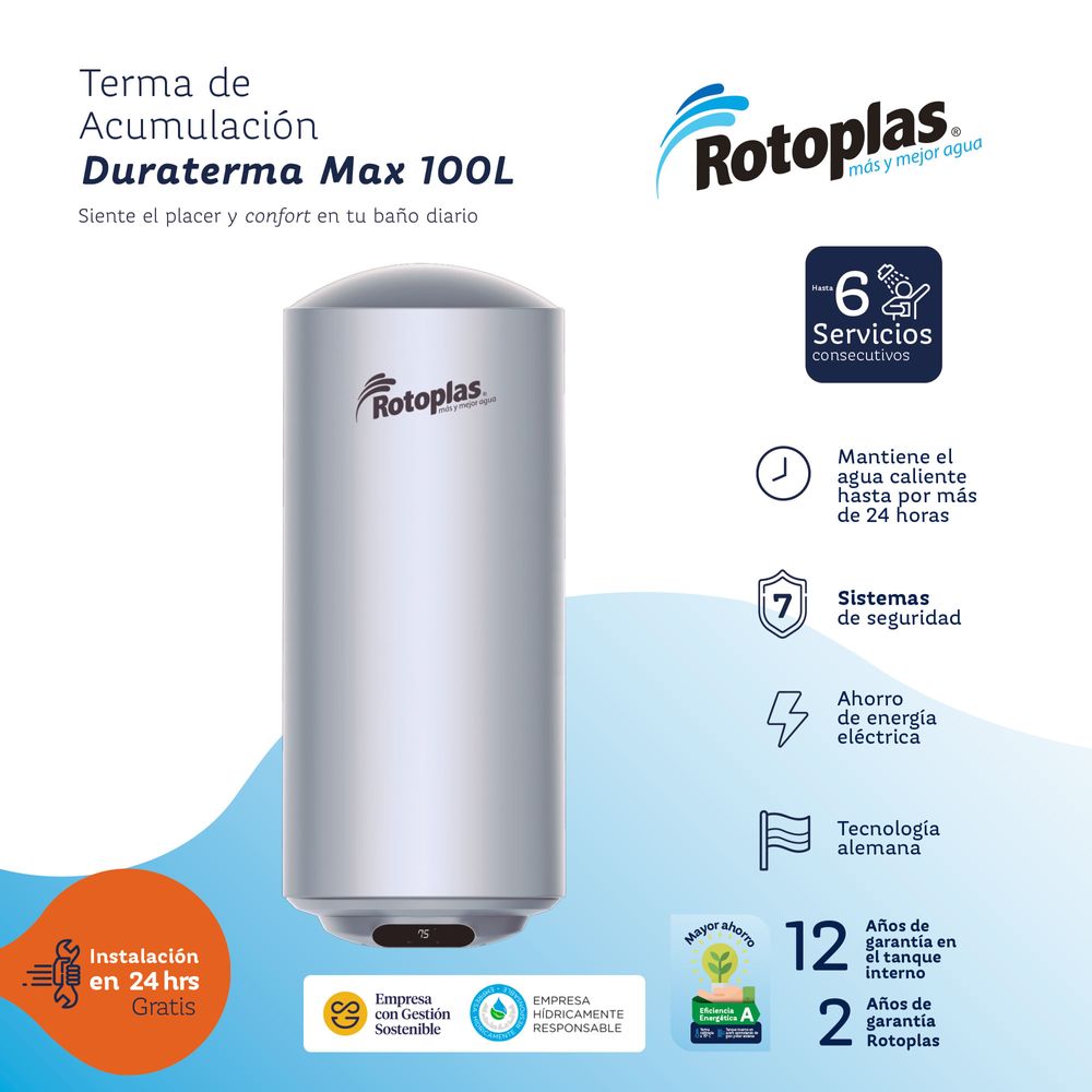 La Terma de Acumulación Duraterma Max 100L Rotoplas está diseñada para brindar agua caliente constante y de larga duración, ideal para familias que requieren mayor capacidad y confort en el hogar. Su sistema de acumulación permite abastecer varios puntos simultáneamente, asegurando una experiencia continua y eficiente.